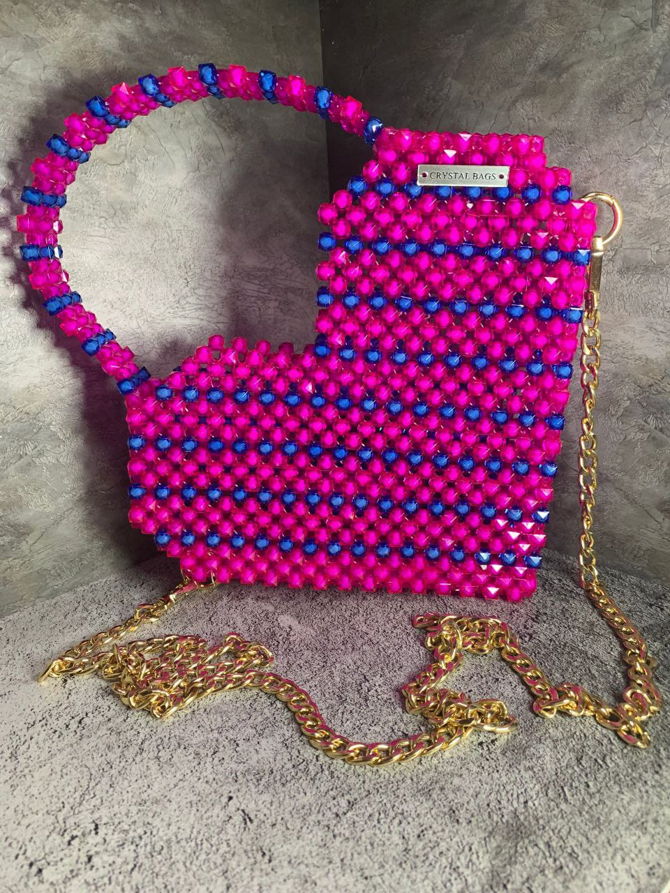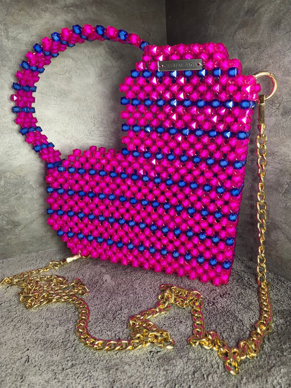 розовая сумка из бусин;