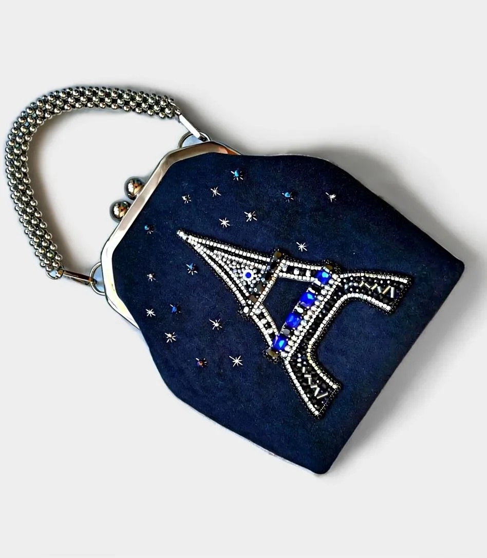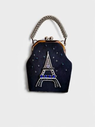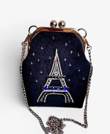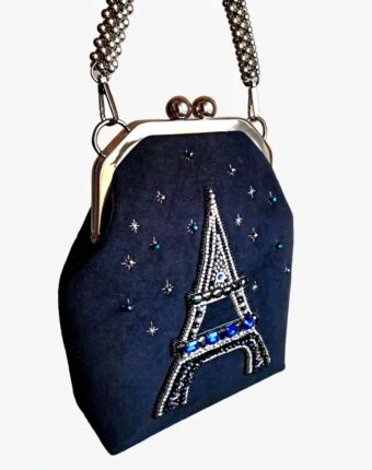 Декор в виде Эйфелевой башни, выполненный хрустальными бусинами, бисером и стразами в цапах, придает ей неповторимый шарм. Внутри сумочки — шёлковая подкладка контрастного цвета с открытым кармашком.
