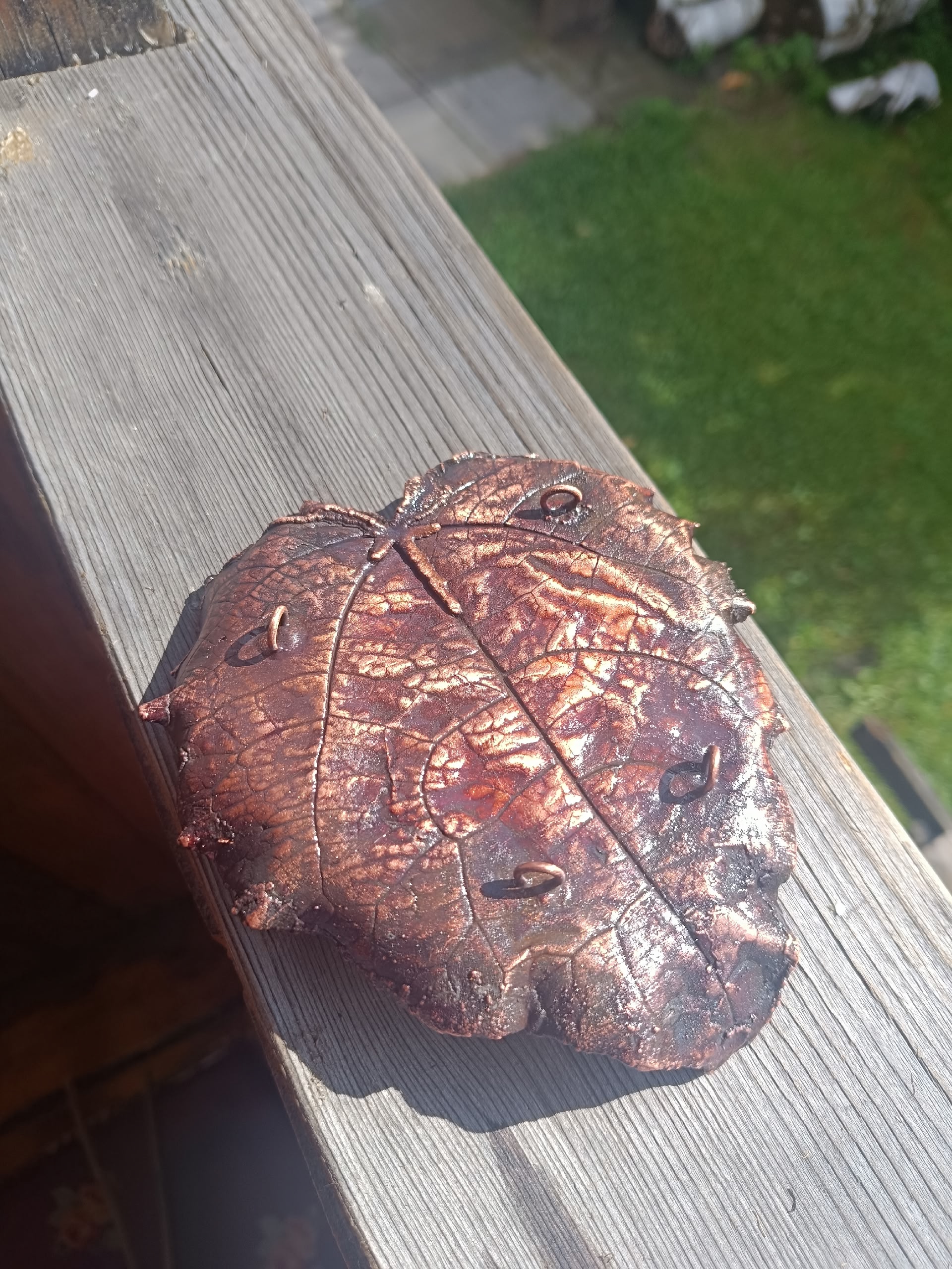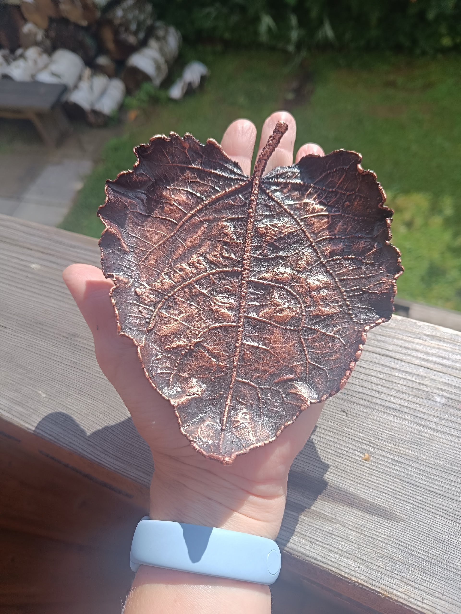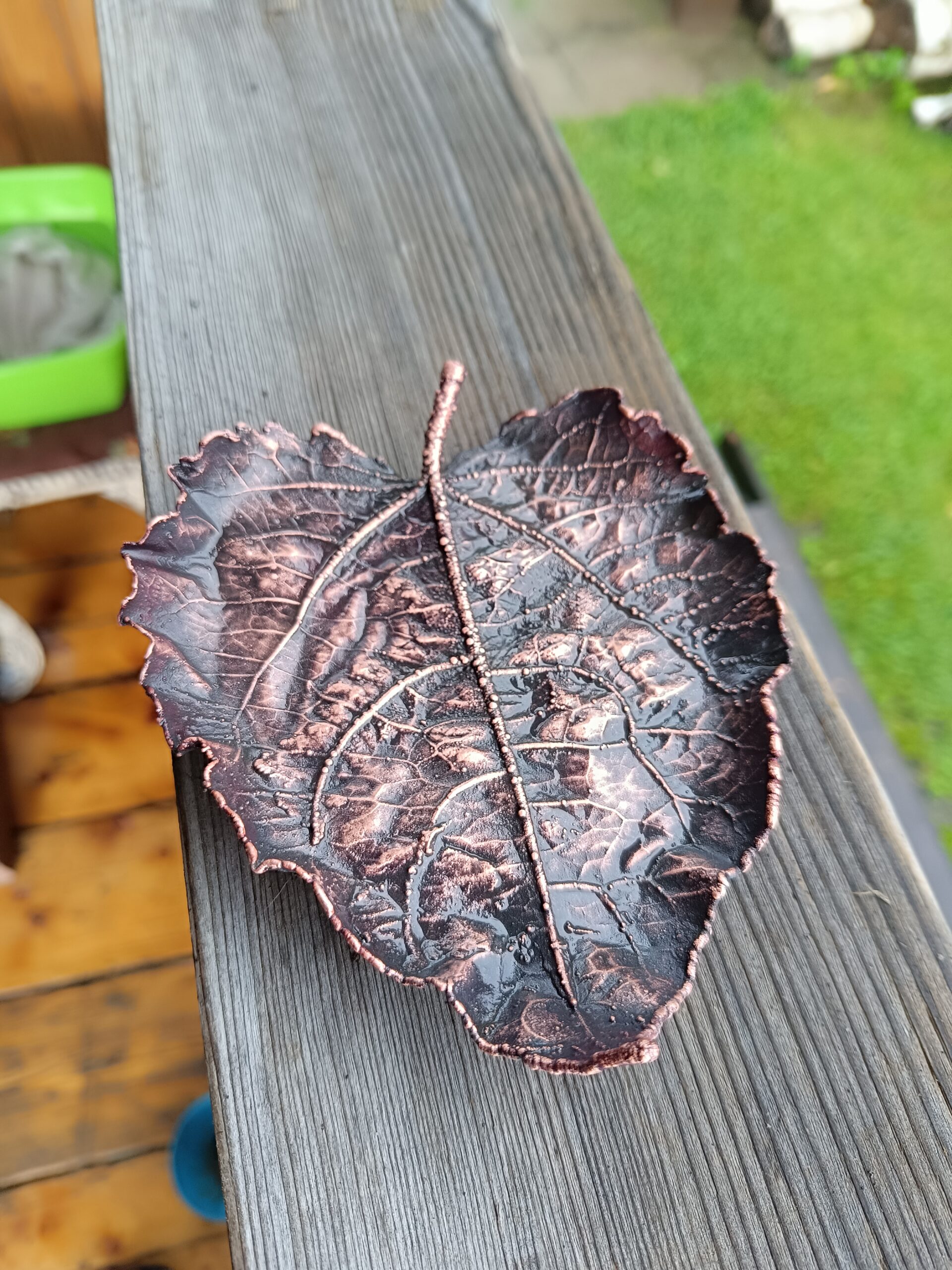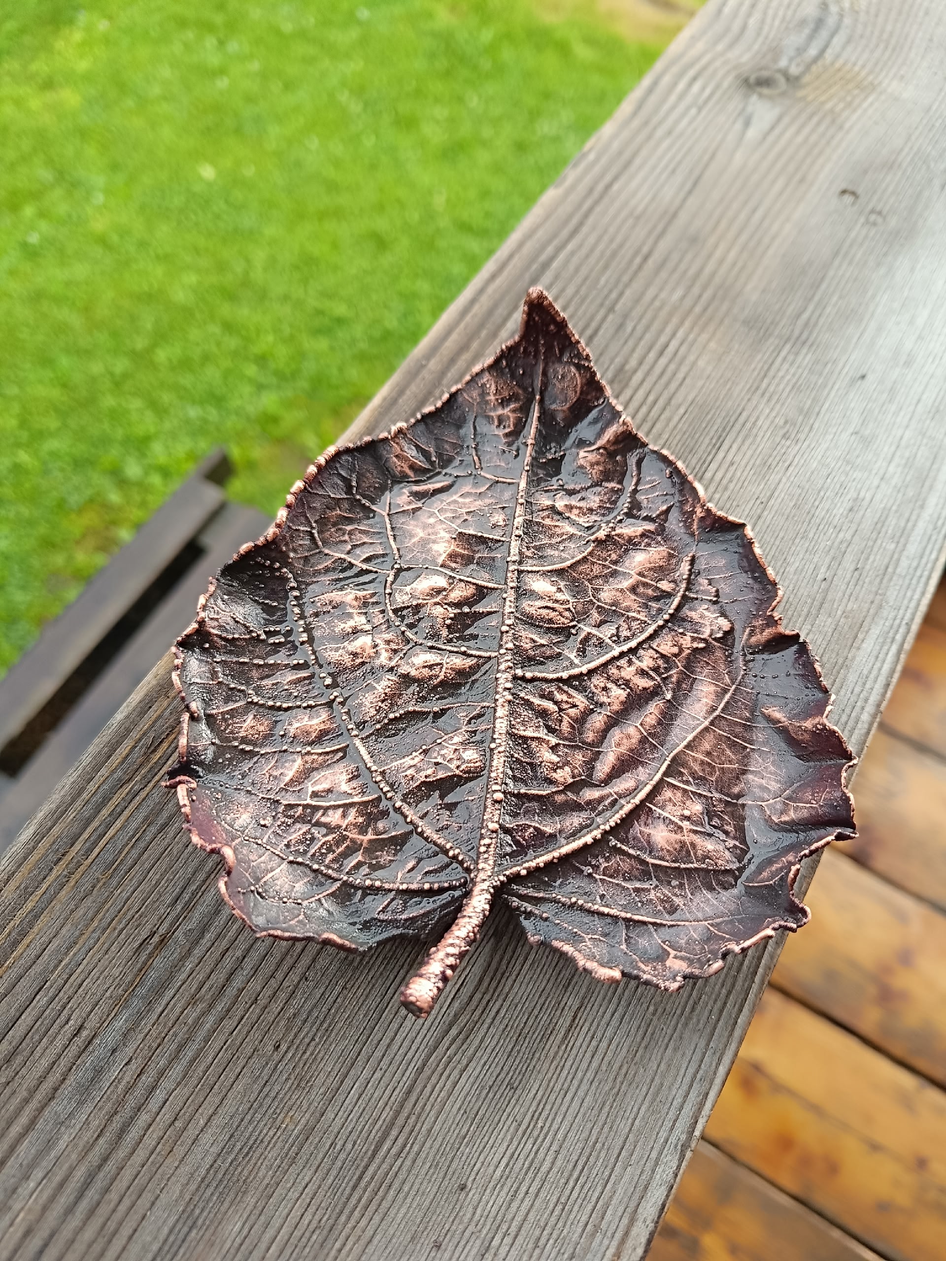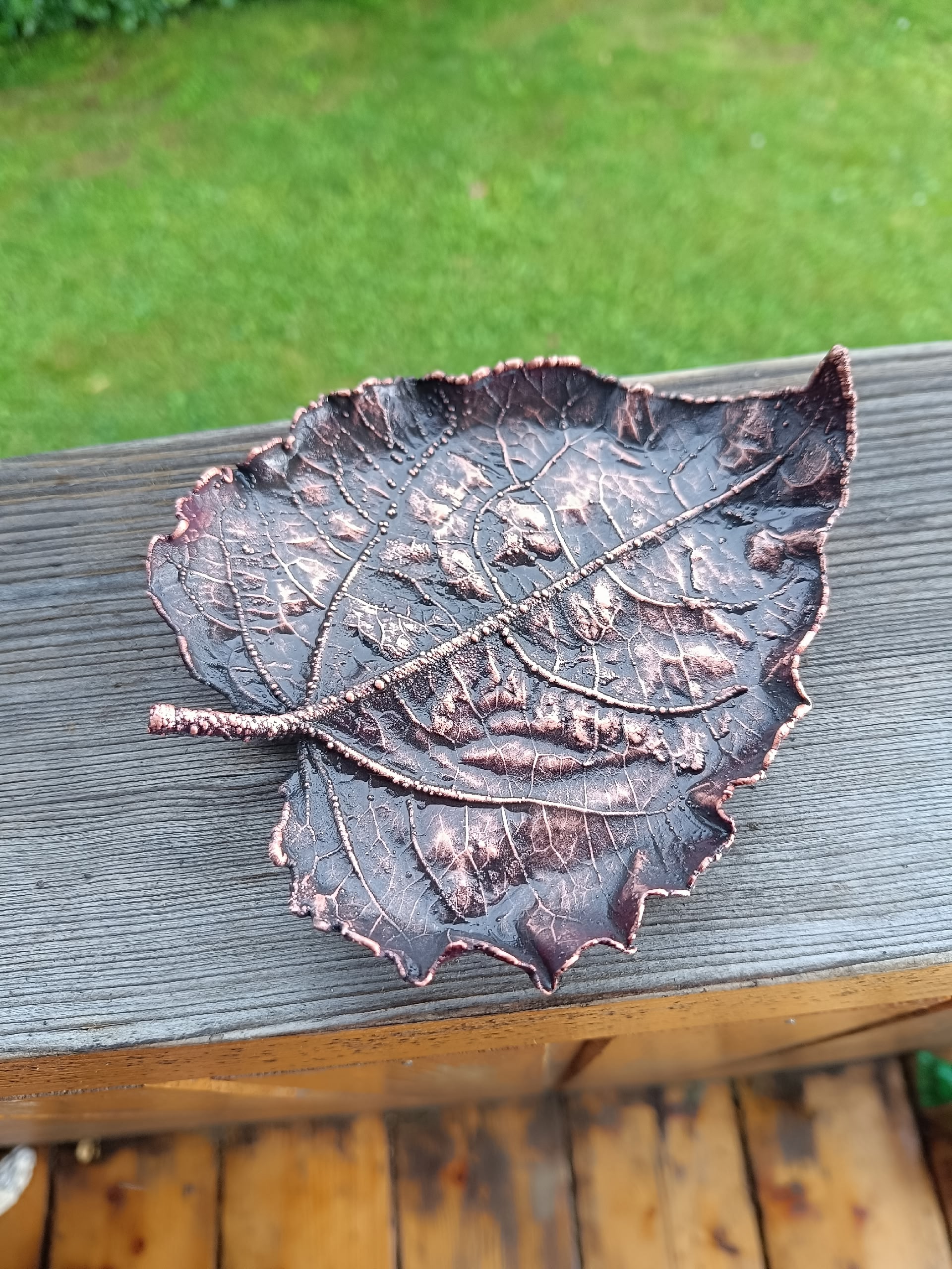 Тарелочка для украшений на небольших ножках. Выполнена из большого листочка осины. Патина чернение. Лак.