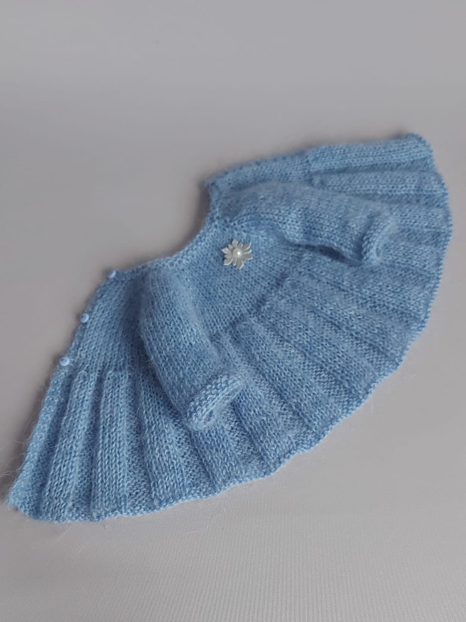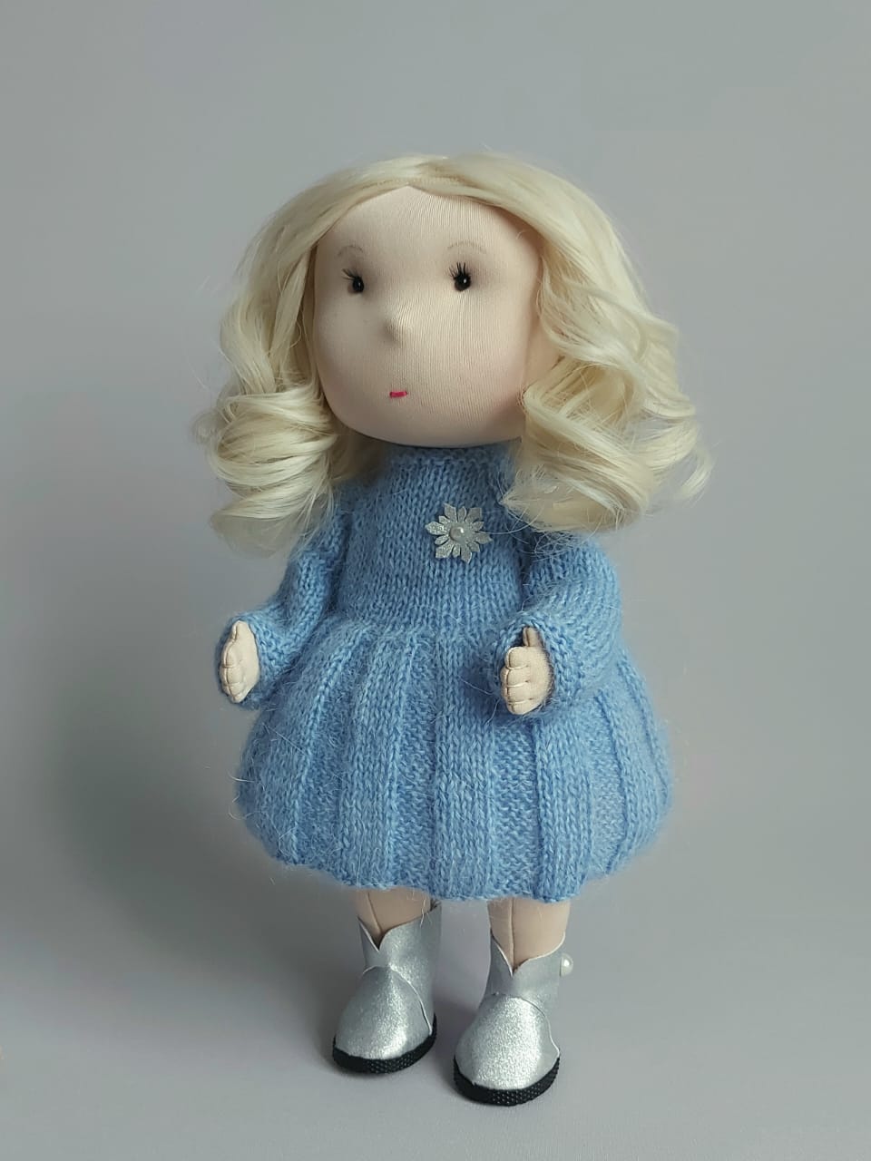 Текстильная кукла Снегурочка. Рост около 30 см. Вязаное платье. Вся одежда съемная. Аксессуар: игрушка снеговик