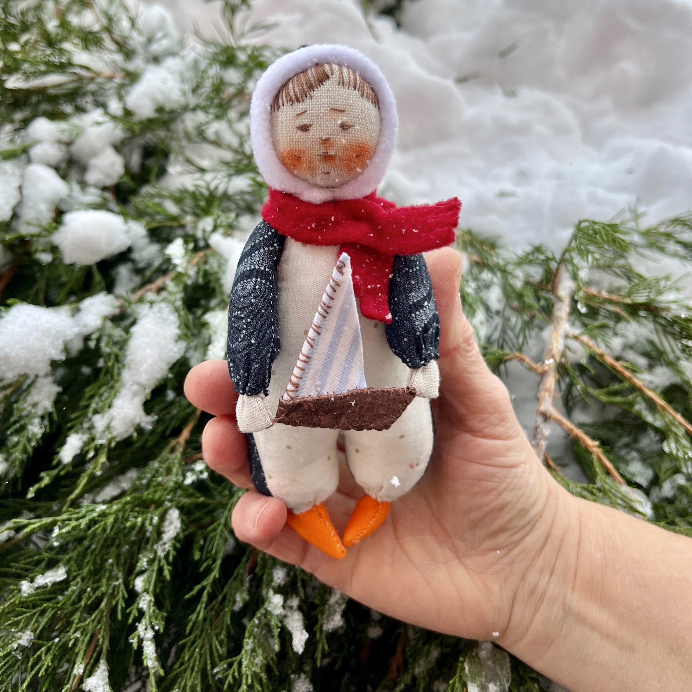 Пингвин — спокойный, с круглым животиком и чёрным клювиком. В лапках он держит маленький кораблик, будто собирается в полярную экспедицию. Вспоминается песенка из детской передачи: «Пингвин‑моряк, бери кораблик в путь, / По льдам и волнам — не забудь оглянуться чуть!» Он напоминает о зимних сказках и приключениях отважных полярников.