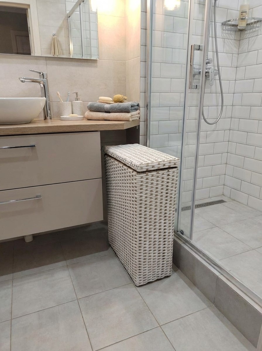 Метки: аксессуары для ванной, интерьер, компактная корзина, Корзина, корзина для белья, маленькая ванная