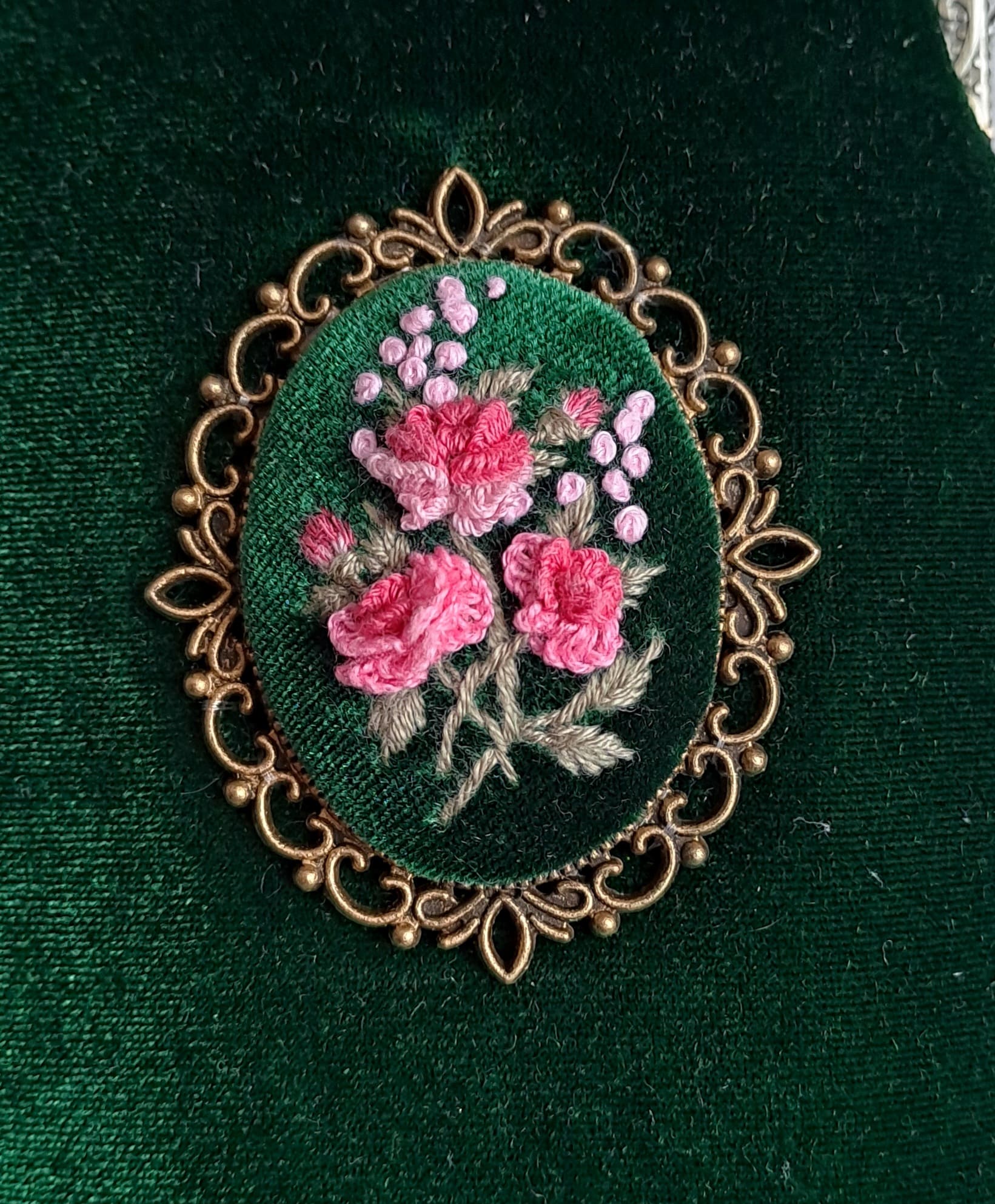 Футляр для очков с пришивным фермуаром выполнен из изумрудного бархата, стенки уплотнены специальными материалами, декорирован медальоном с ручной вышивкой.