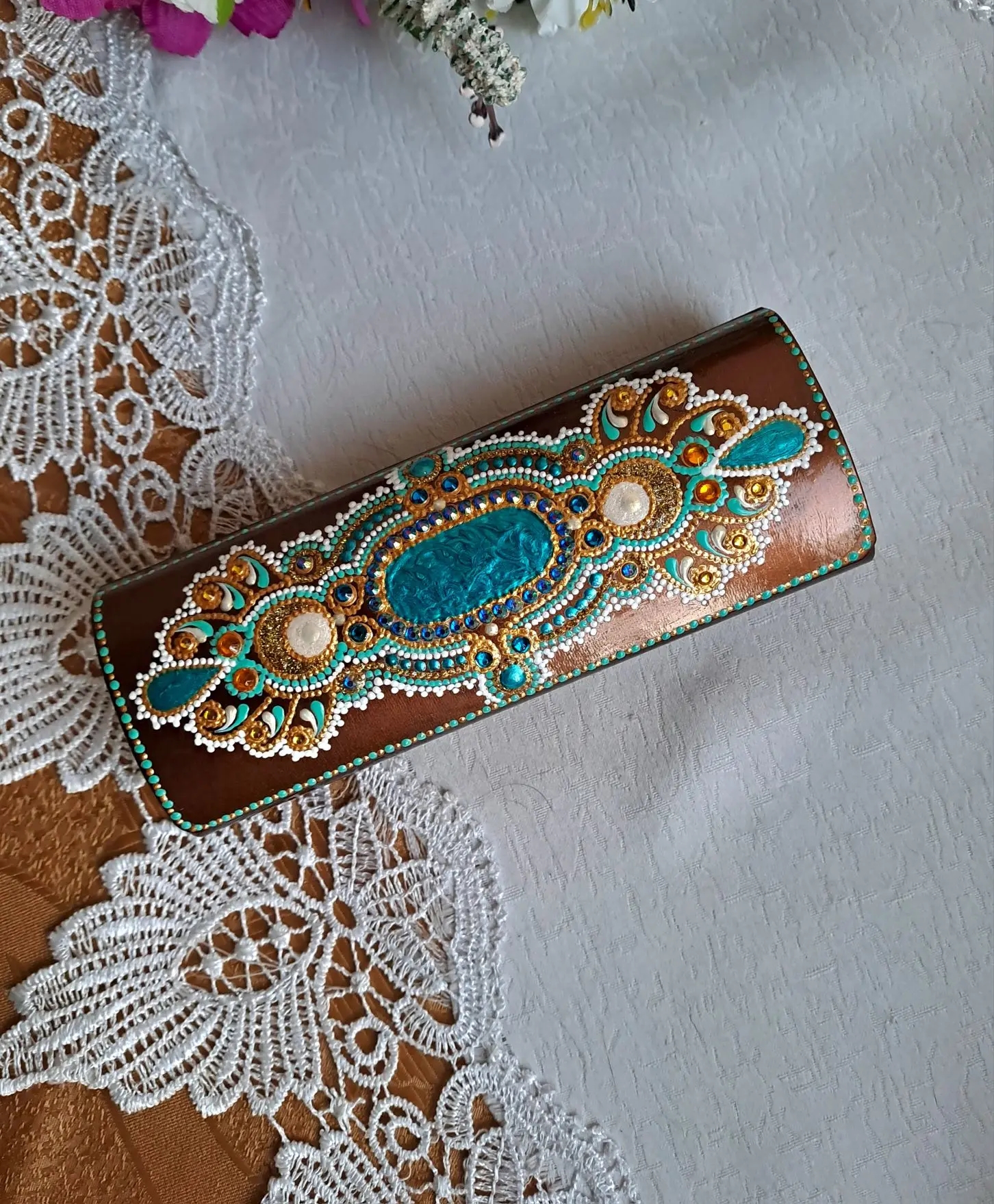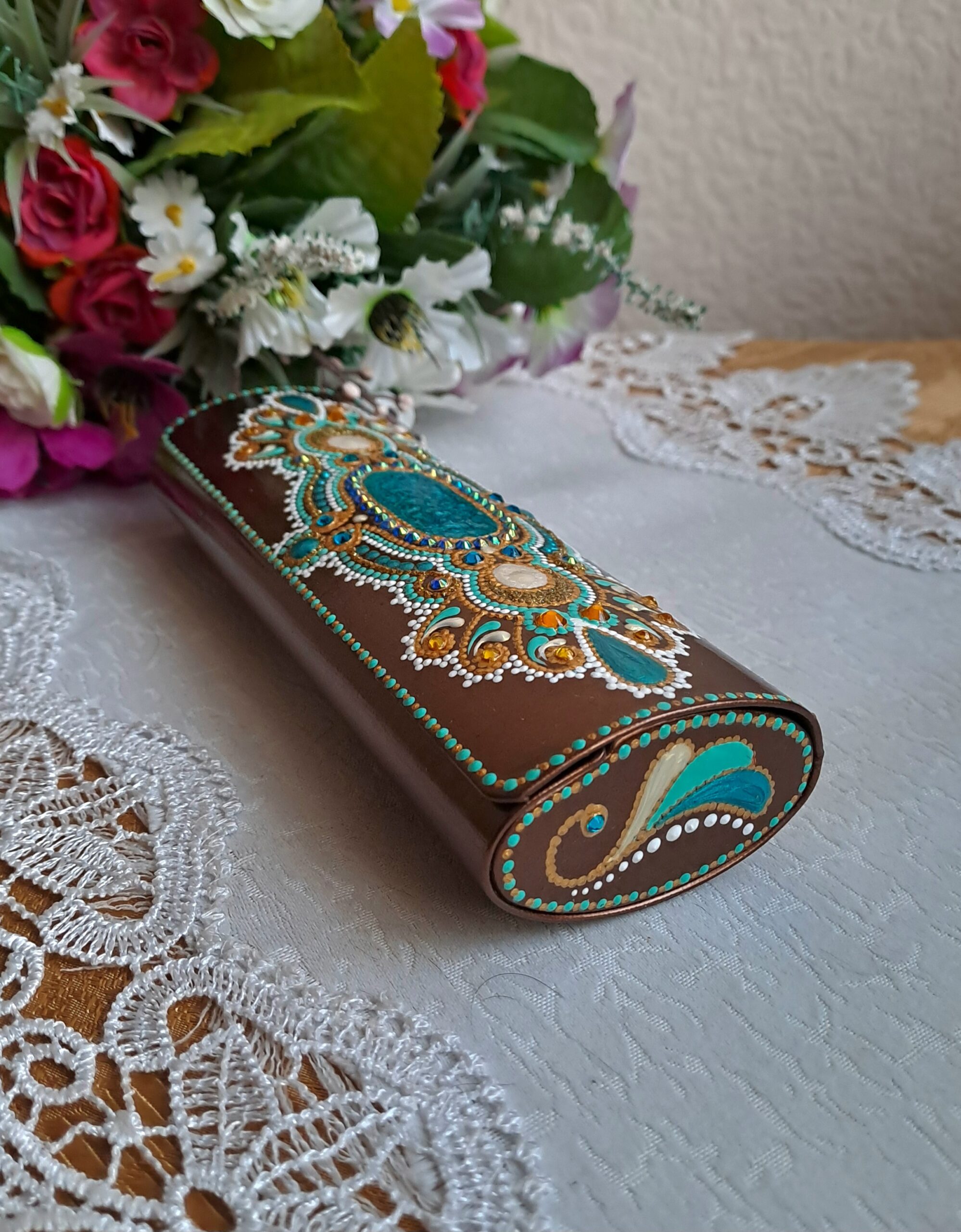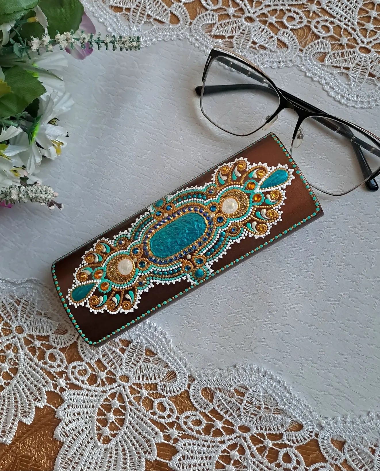 Футляр для очков декорирован в технике точечной акриловыми красками и контурами с инкрустирован стразами, сверху роспись закреплена несколькими слоями акрилового лака.
