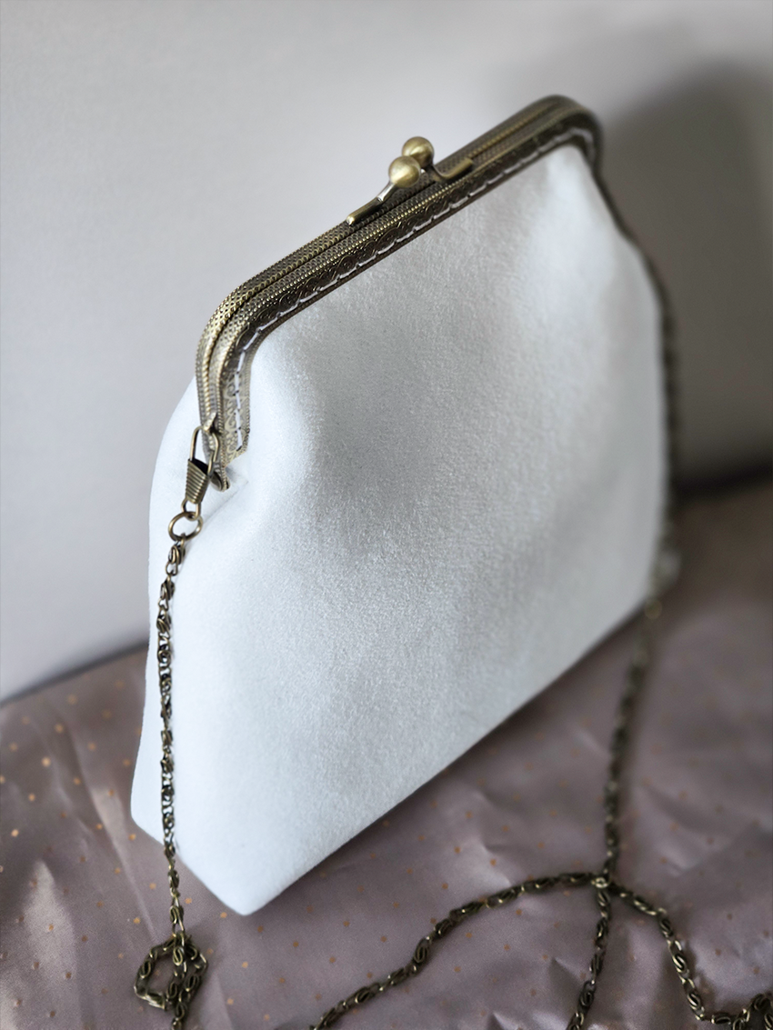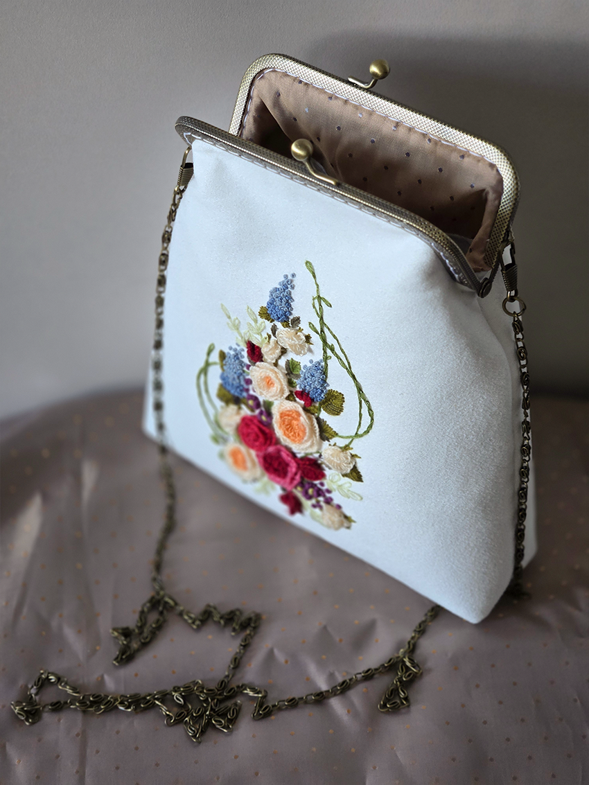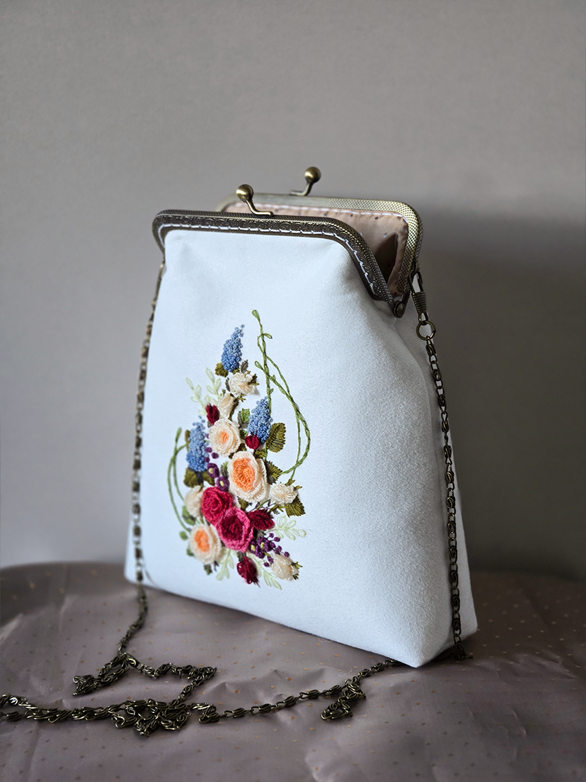 Каждая сумочка рождается в моей мастерской с особой заботой: от выбора ткани до мельчайших стежков ручной вышивки. Элегантный фермуар завершает композицию, добавляя нотку утончённости и ретро‑шика.