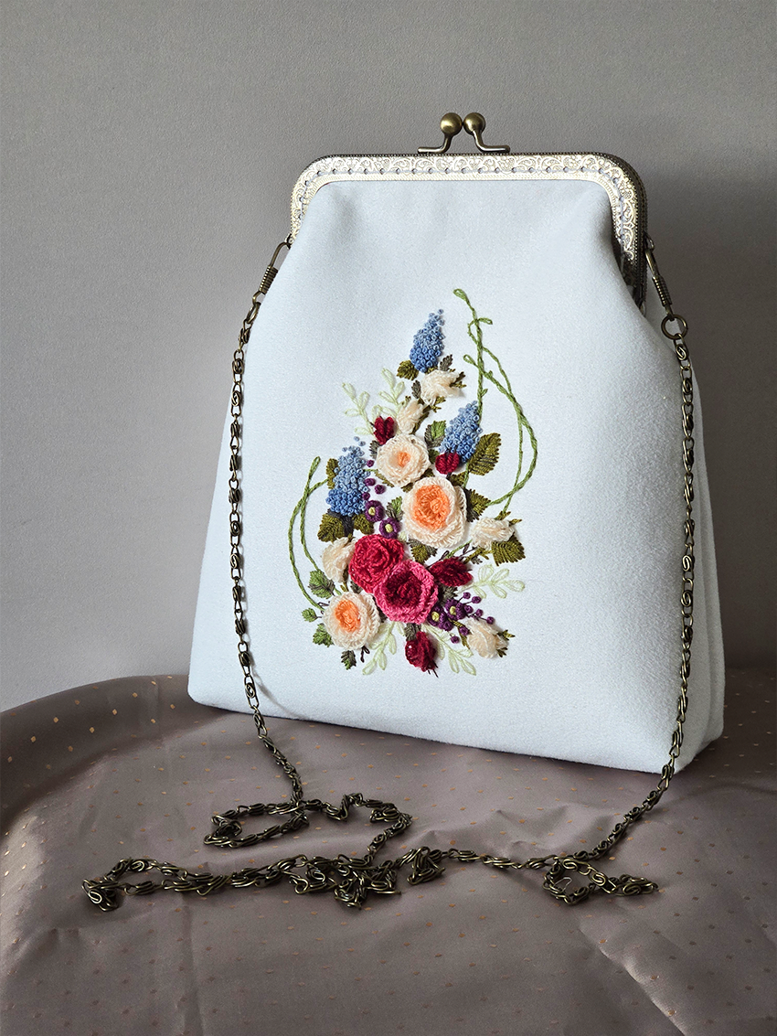 - центральная часть сумки украшена объёмной вышивкой в виде цветочной композиции: