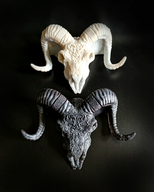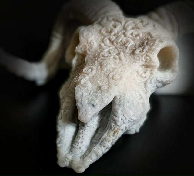 Полноразмерный череп козла цвета старой кости — это и есть такая печать. Его поверхность покрыта выпуклыми витиеватыми узорами, которые при свете дня выглядят как нежный рельеф, а при луне (или при тёплом свете лампы) начинают отбрасывать таинственные тени, словно знаки оживают.