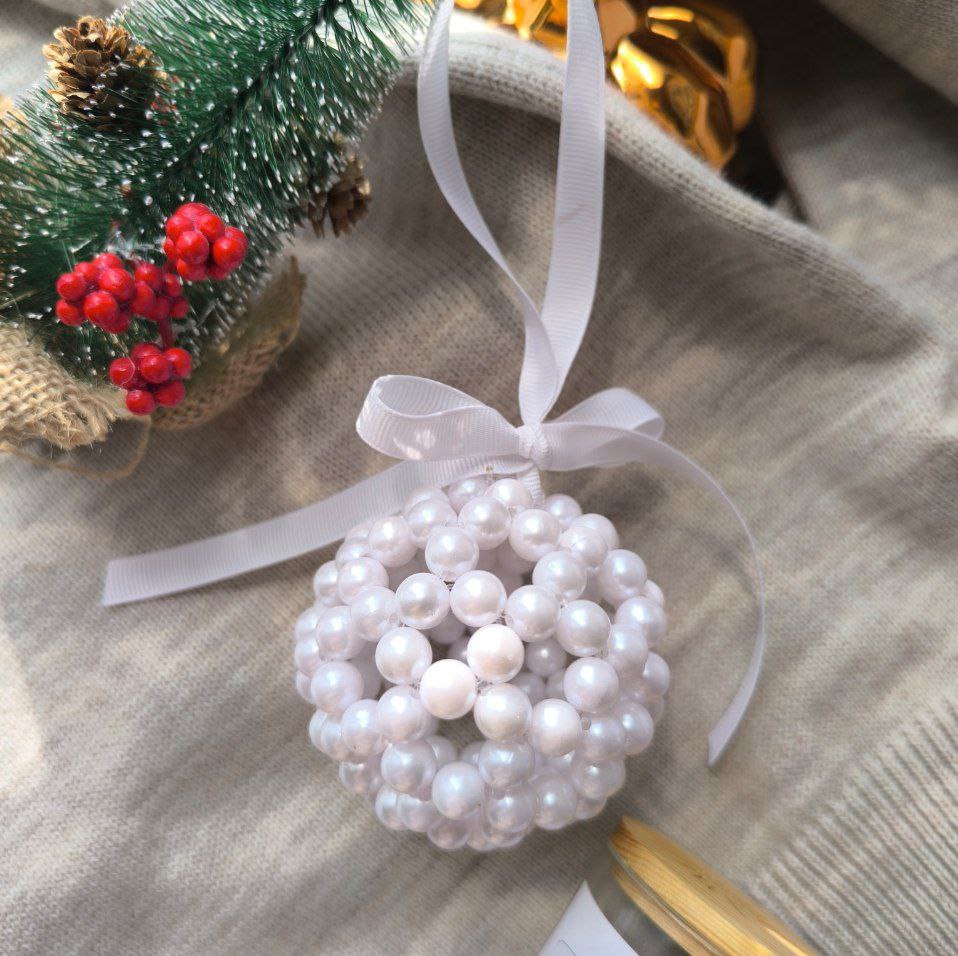 Ёлочный шар из акриловых бусин, выполнен вручную, что гарантирует уникальность каждого изделия. Его поверхность покрыта мелкими бусинами диаметром 10 мм, создающими эффект мерцания при любом освещении. Сам шар диаметром 7см.